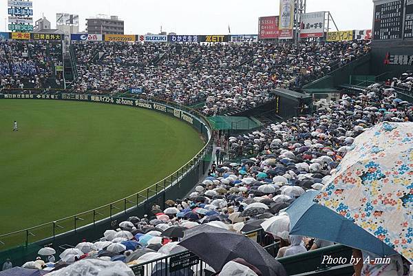 雨勢越來越大.全場都撐起了雨傘..