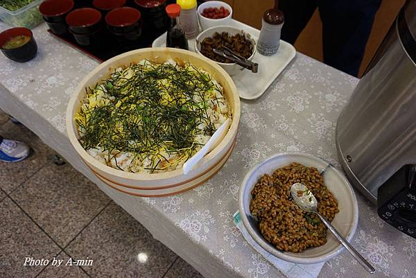 用木盆裝著.看起來就很好吃的樣子.. 右下這一大盤是納豆..