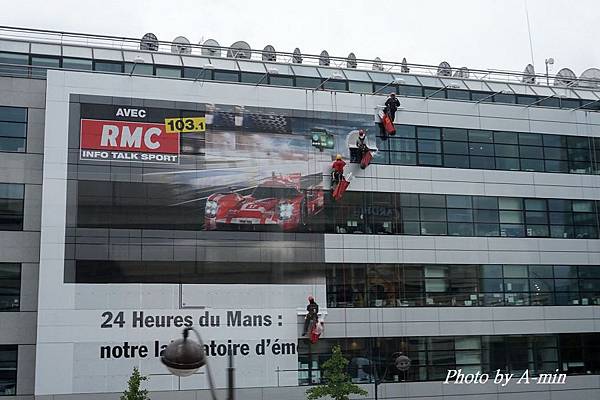 工人用垂吊的方式在大樓外牆貼巨幅廣告~