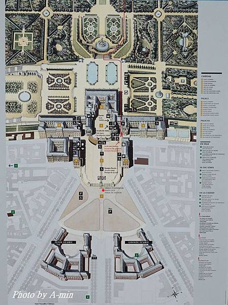 從中間的配置圖來看.凡爾賽宮幾乎正朝著東方.(圖的下面是東方)