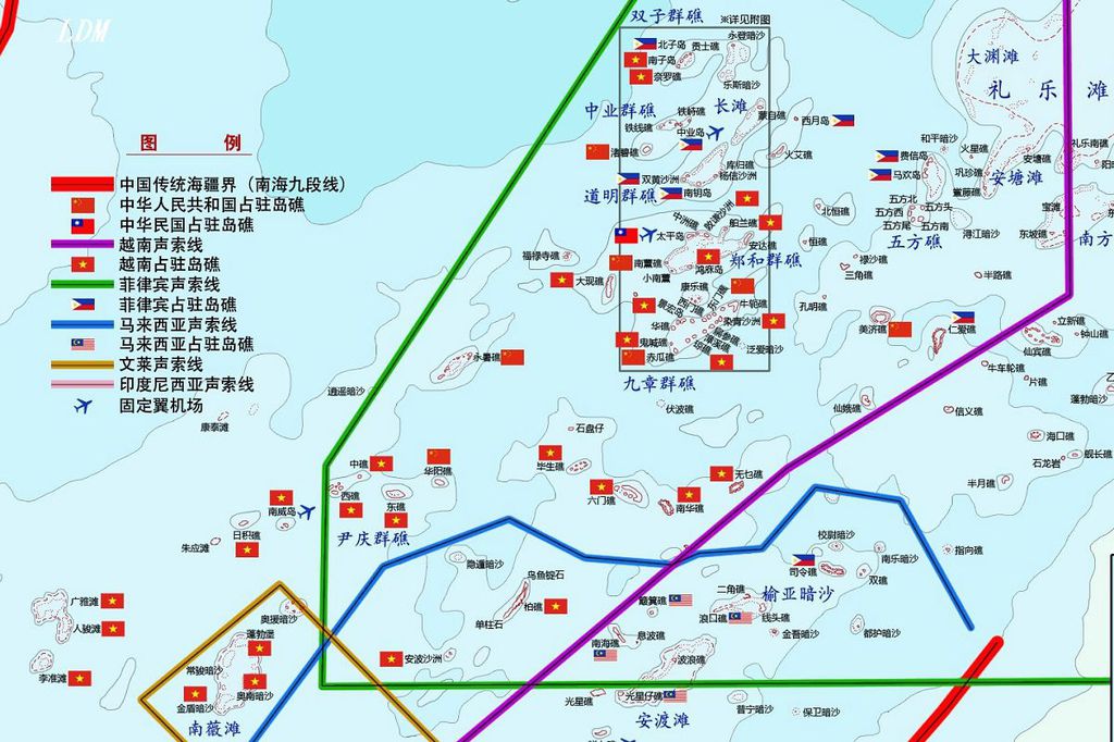 南海上.並不是汪洋一片.到處都有經過武裝的島礁甚至淺灘.