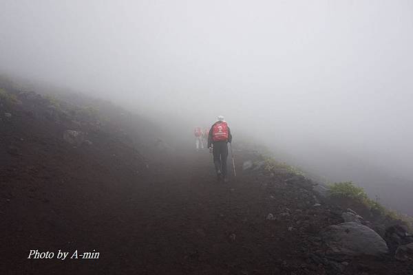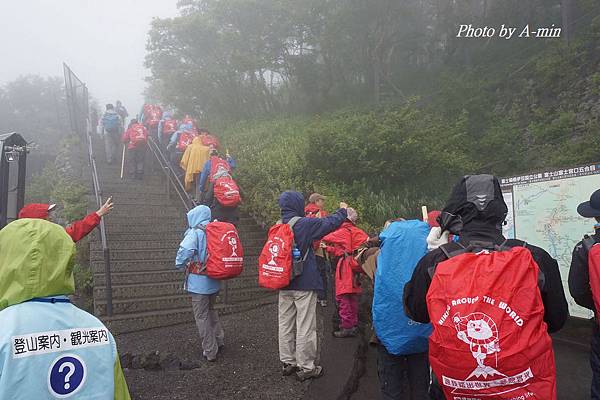 走上山路.雨霧的天候.幸好有統一的紅色防雨套.很容易認出隊友~