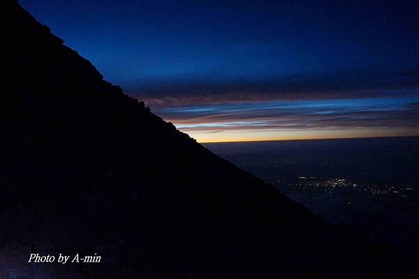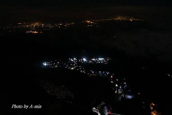 就著曙光回頭俯瞰山下..長長的人龍像是從雲縫裡鑽上來..