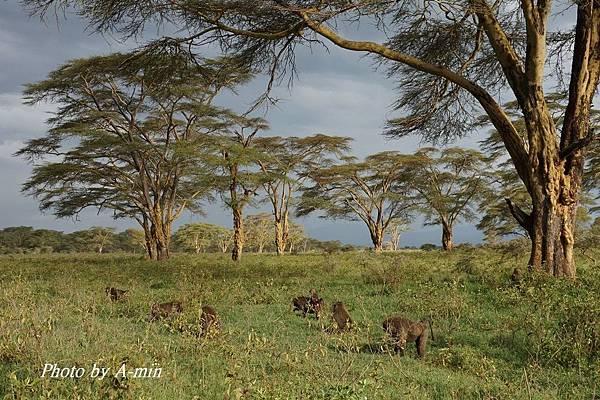 樹下有一小群狒狒(Olive Baboon)在覓食.