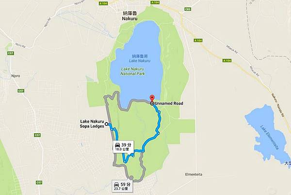 從旅館Lake Nakuru Sope Lodge出發到湖邊的獵遊路線.