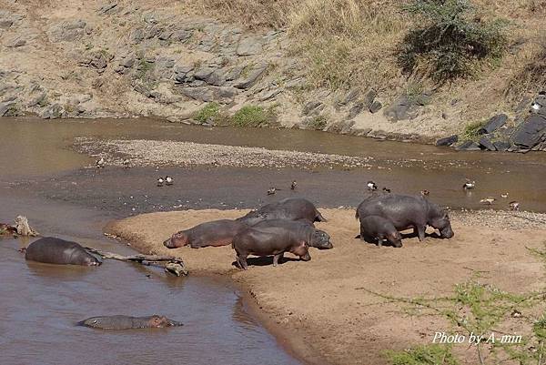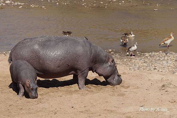 沙洲的另一邊是河馬母子.還有淺灘裡的埃及鵝.