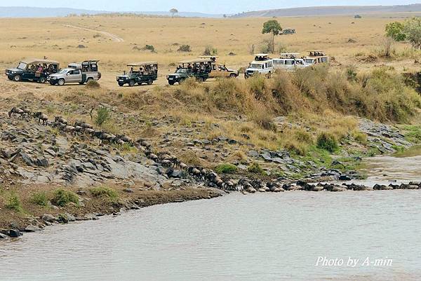 有一群牛羚來到河邊.所有的獵遊車都圍了上來.