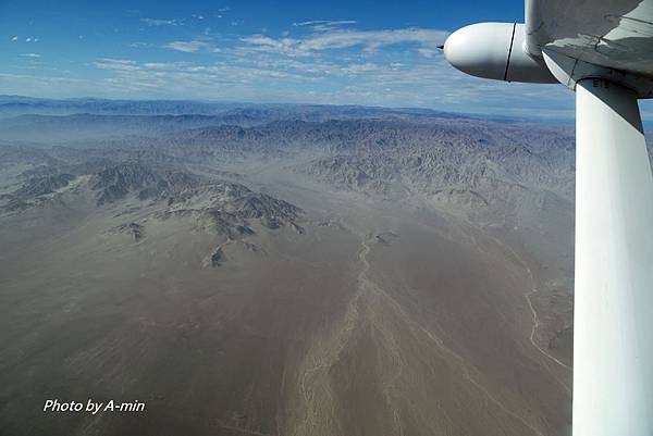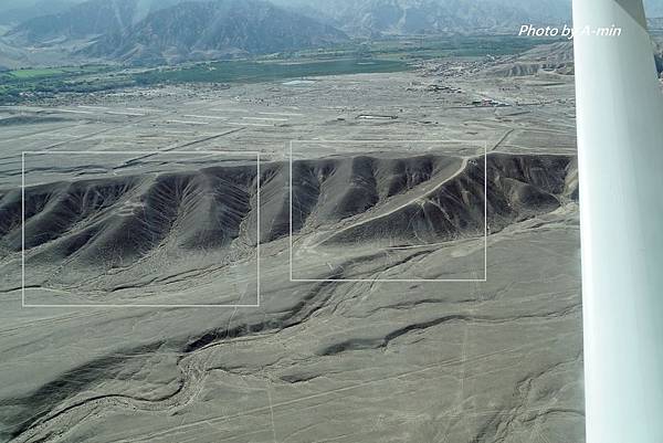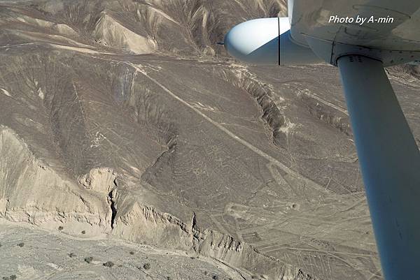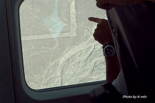 副機長指著窗外開始介紹.我只能隱約看到山坡上有圖案.