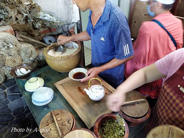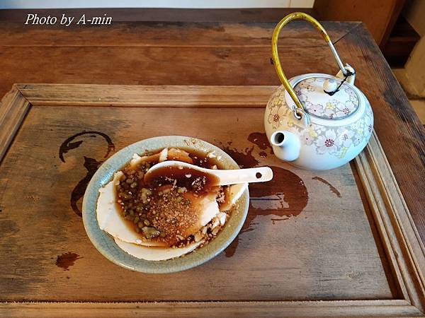 小茶壺裡裝的是甜湯.因為碗很淺.裝滿豆花而甜湯很少.可以自己再倒.
