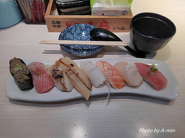 由左至右:蟹膏、炙燒鮪上腹、甜蝦、星鰻、花枝、炙燒鮭肚、干貝、鮪上腹.