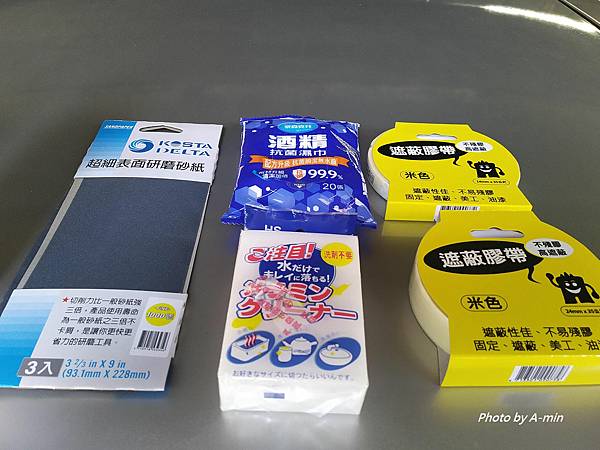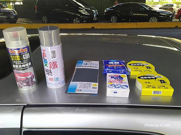 噴漆、砂紙、酒精濕巾、泡棉、遮蔽膠帶..