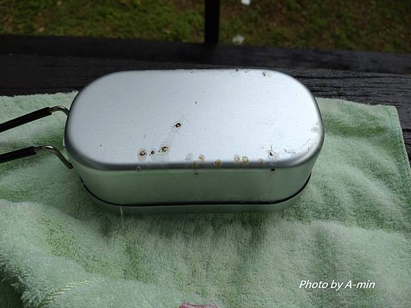 飯盒底部有一點湯汁滴下來被燒焦的痕跡..
