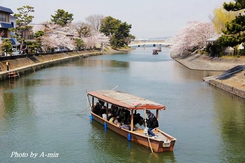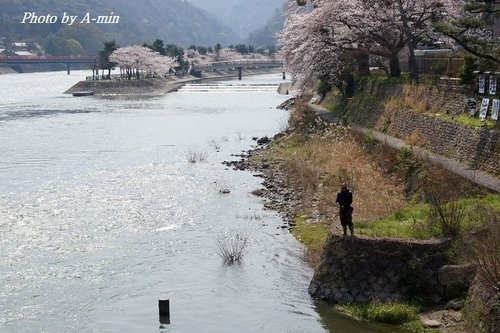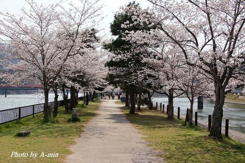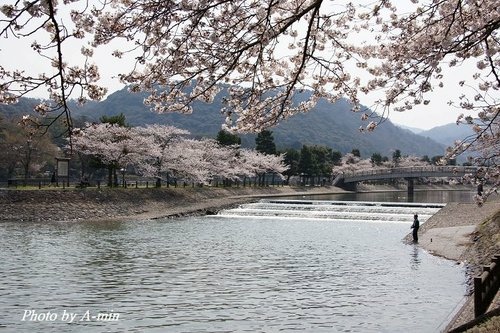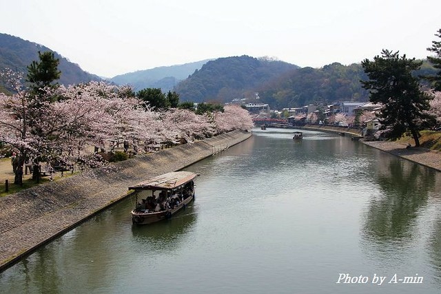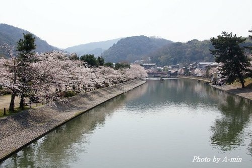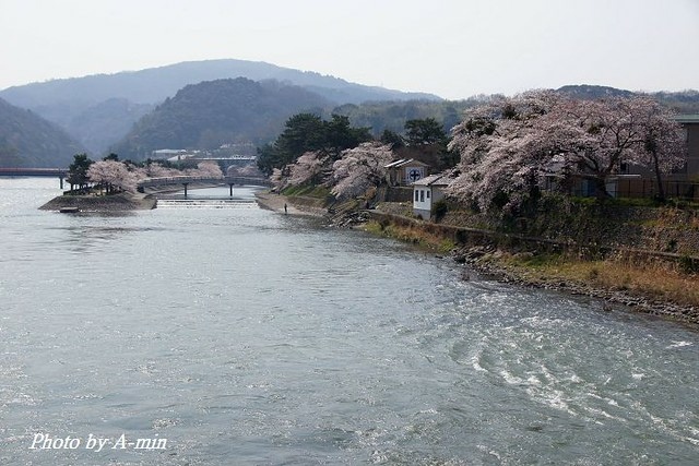 從宇治橋上遠眺宇治的老街.. 櫻花果然盛開著..