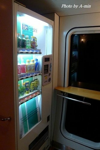 口渴了.正好這節車廂的門口就有自動販賣機.去看看吧~