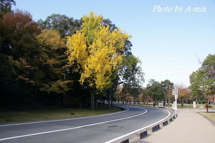 春日大社參道森林臨馬路旁一棵鮮黃的銀杏樹..