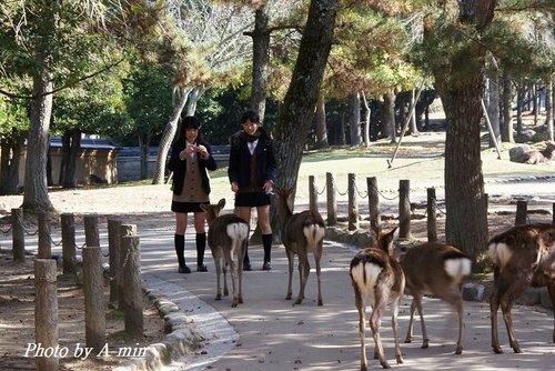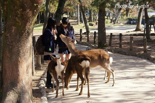 旁邊有女學生買了仙貝準備要來餵鹿..