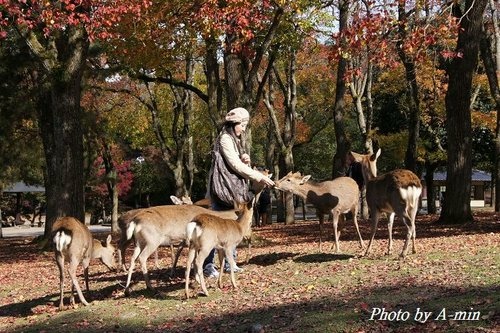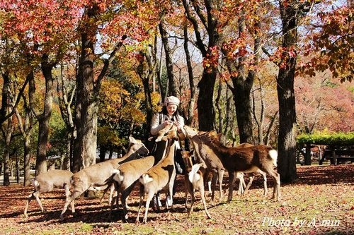 這位美女的態度很從容.. 就讓鹿這樣包圍著.把仙貝給餵完~