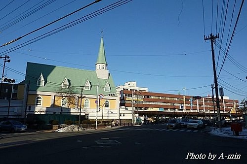 過馬路回頭拍教堂.稍遠處深咖啡色的橫條型建築.就是釧路車站..