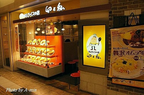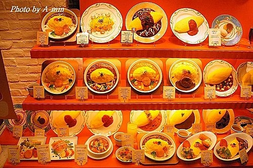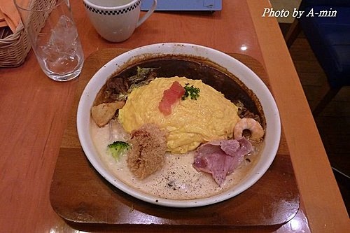 同時有兩種醬汁的蛋包飯. 白的是奶味醬.深色的是牛肉醬汁..