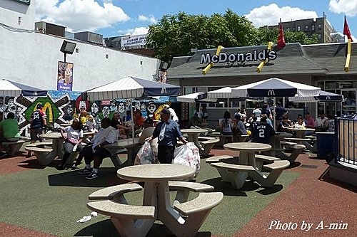 麥當勞原來的顏色是黃紅配..在洋基球場旁.紅色.可能不太受歡迎...