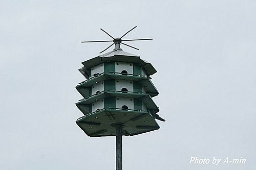 ↓ 湖邊的公園裡豎立著一座鳥屋..