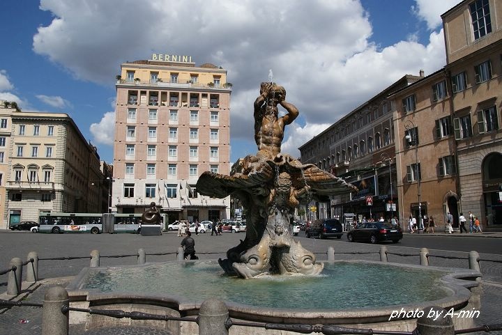 噴泉背後是 貝尼尼飯店. 從飯店右側的 巴貝里尼路 往上走就會通到 勝利聖母教堂.