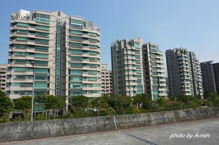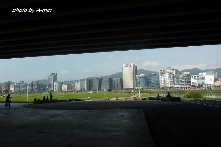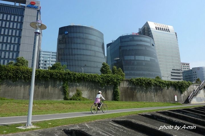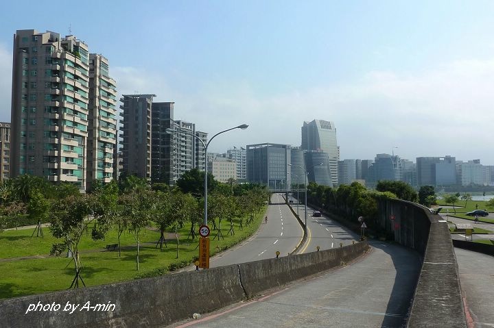 堤防上有一道斜坡.可騎上堤防頂.. 欣賞大直重劃區的豪宅大樓群. 以及內湖重劃區的摩登辦公大樓群.
