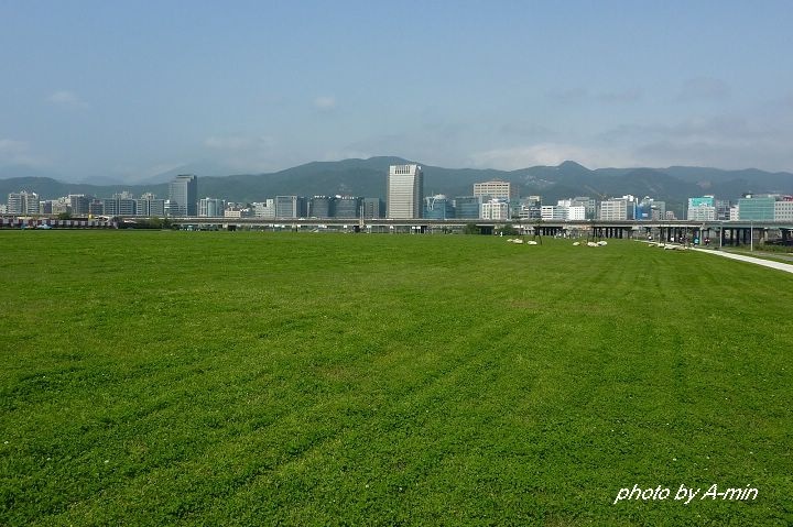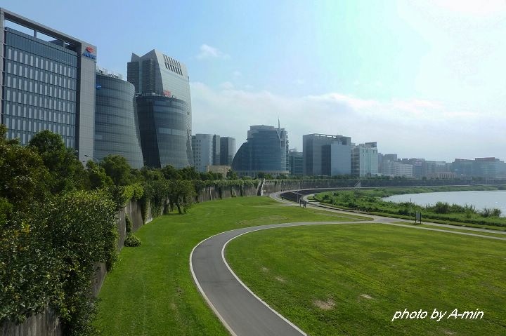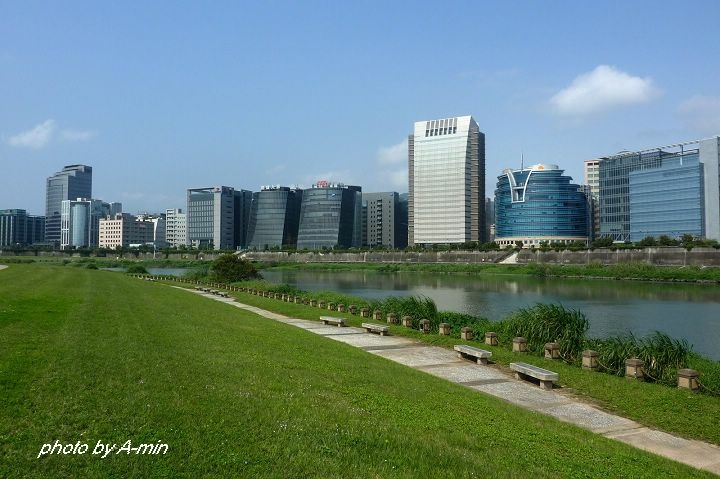 從河濱公園遠眺內湖重劃區的摩登辦公大樓群.