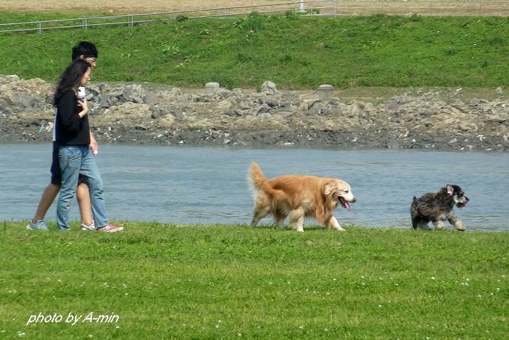 這邊的河濱公園有鐵絲往圍起來的蹓狗區. 主人們把狗狗放開也不擔心狗會走失.