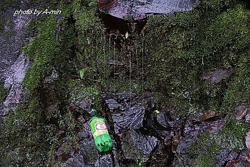 山壁上有一泓泉水從這邊流下來.. 還放了一個寶特瓶接水.大概是巡山人員的傑作..