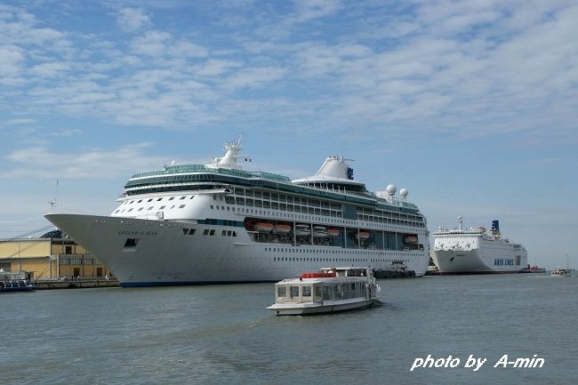 等待接駁船的同時.. 目光集中在對面碼頭停泊的超級遊輪.