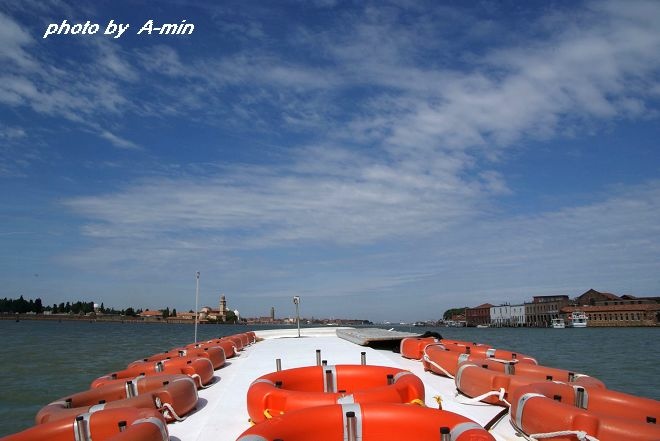 搭上了接駁船. 在 Giudecca運河上航行著.. 旁邊出現一艘跟我們搭乘的船同型的船隻..