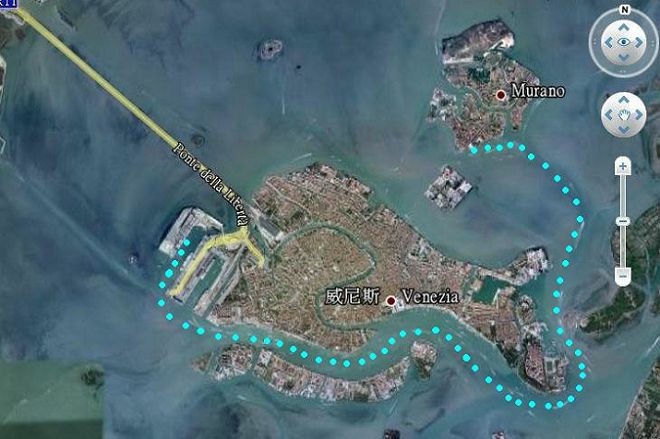 從威尼斯島的入口碼頭到Murano島的航行路線圖.