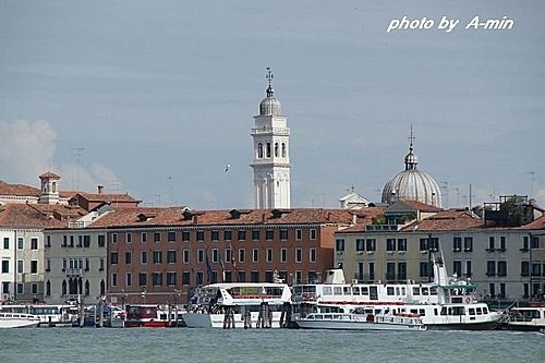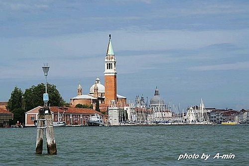 前方的人字型木樁.是用來標示航道的. 遠方的圓錐綠頂尖塔.是聖喬治馬喬雷教堂的鐘塔.