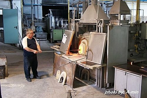 示範的師傅.用鋼管從窯爐裡取出一坨熱軟的玻璃..