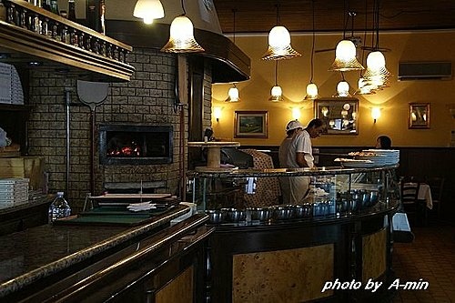 廚師背後的.就是磚石砌的披薩烤爐.. 可以看到裡面還有燒紅的炭火..