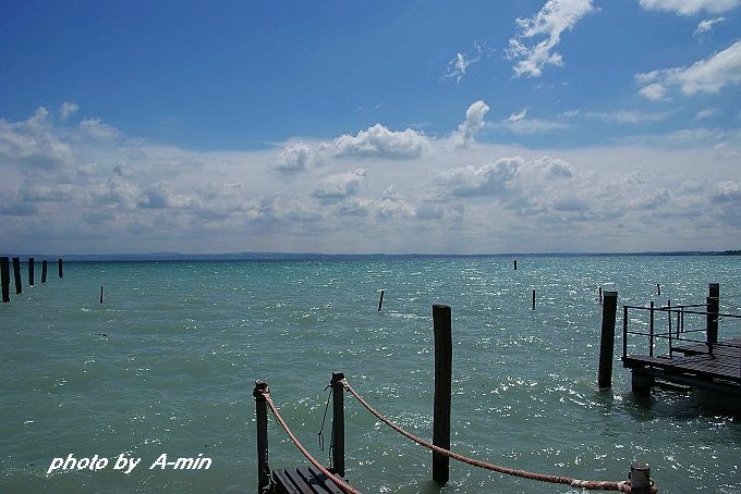 來到碼頭旁的遊覽車停車場. 上車之前看到這片湛藍的湖面. 趕快又衝到湖邊按快門..