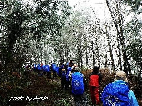 在霧雨中前進.. 這次有不少隊友.共28人 林道入口海拔1948