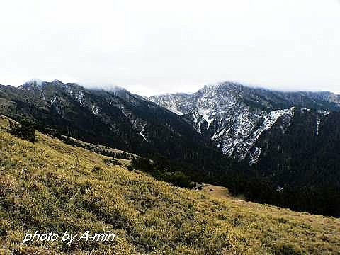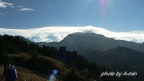 回到岔路口.遠眺南湖大山.. 正好有雲帶壟罩.. 難道..是要變天了?