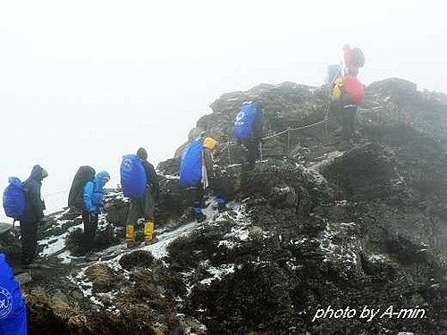 天氣轉壞.. 夾帶著冰霰的雲霧襲來.. 腳下是積著薄冰的裸岩..