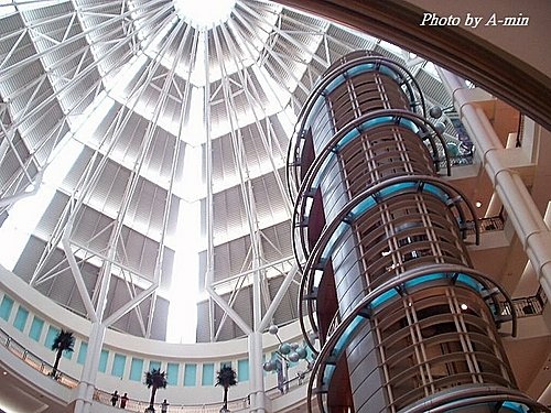 從中庭仰望天井.右邊的橢圓柱狀物是電梯..