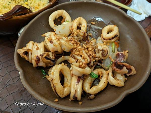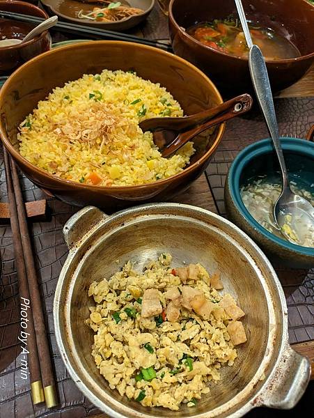 中間大盆是炒飯、下面金屬盤是炒蛋(像菜脯蛋)