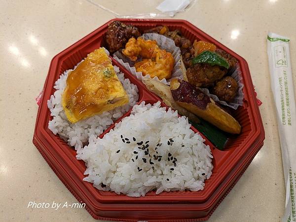菜色:煎蛋、乾燒蝦仁、肉丸、糖醋排骨、地瓜..