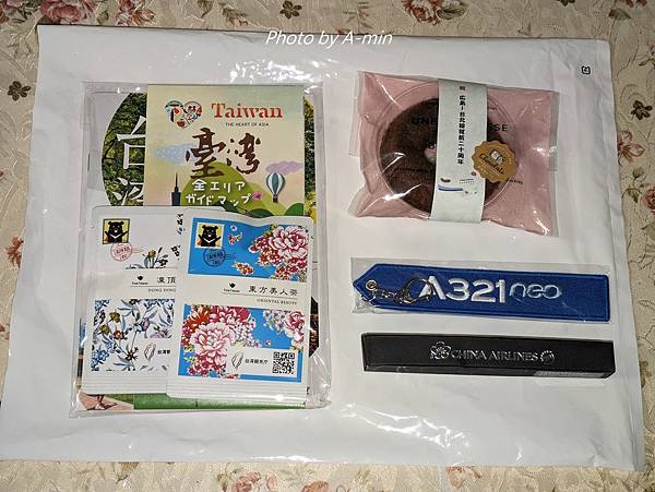 有台灣旅遊小冊、茶包、蛋糕、布條、原子筆.