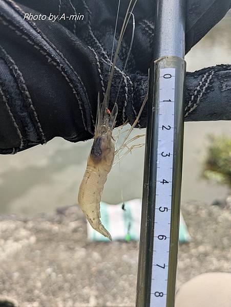 等浮標沉得更深些..果然釣起一尾長臂蝦.