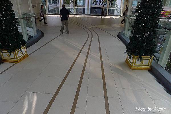 這購物中心外的空中走廊地板有一些曲線的裝飾線條..